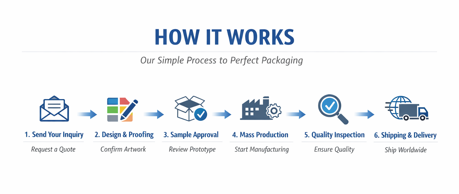 Each batch goes through multiple QC checkpoints—material, printing, cutting, gluing, packing—to guarantee perfection before shipping.
